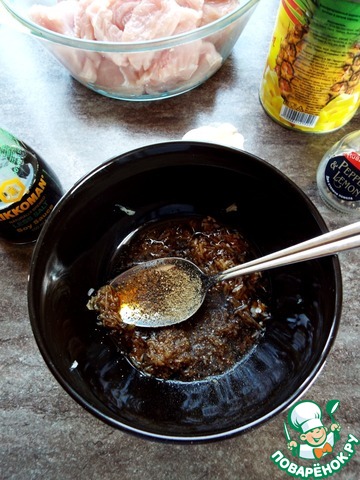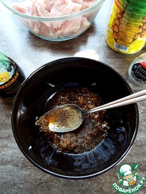В миске смешать соевый соус, чеснок, соль и перец с лимоном (можно взять черный перец, но чуть меньше).
