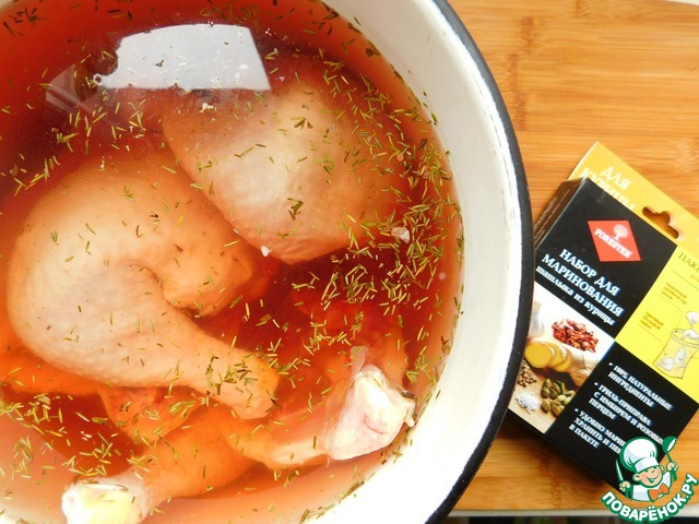 Охлаждённые куриные окорочка выкладываем в кастрюлю и заливаем подготовленным солинадом. Накрываем и убираем кастрюлю с окорочками в холодильник минимум на 12-ть часов.