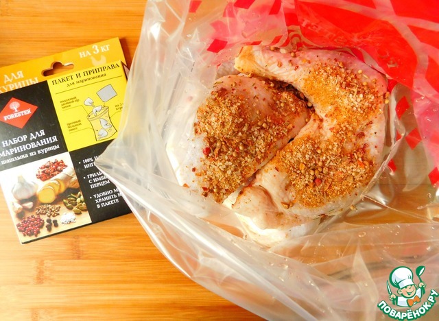 Вынимаем окорочка из кастрюли, даём лишней жидкости стечь. Перекладываем окорочка в пакет для маринования от Forester, добавляем сухую приправу-гриль от Forester. Я добавляла приправу из расчёта 1 столовая ложка на 1 куриный окорочок. В тот же пакет добавляем 2 столовые ложки растительного масла.