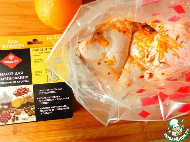 В пакет с окорочками добавляем апельсиновую цедру и 2-3 столовые ложки апельсинового сока. Закрываем пакет, встряхиваем, что бы цедра и сок равномерно распределились и мясу. Убираем пакет с окорочками в холодильник на 1 час. За это время окорочка пропитаются вкусами и ароматами от маринада Forester и апельсина.