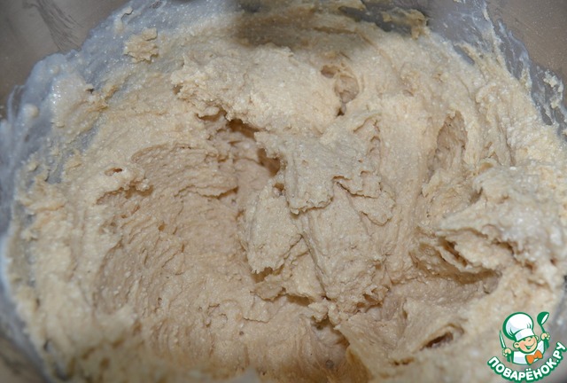 • Включить духовку, нагрев 170 градусов. Творог, яйца, масло и сахар выложить в дежу комбайна. Смешать на малой скорости. Муку, соль и разрыхлитель смешать, просеять. Добавить к творожной массе. Тщательно вымесить.