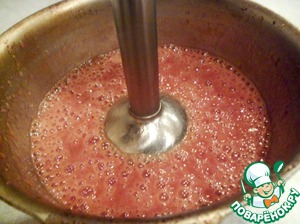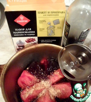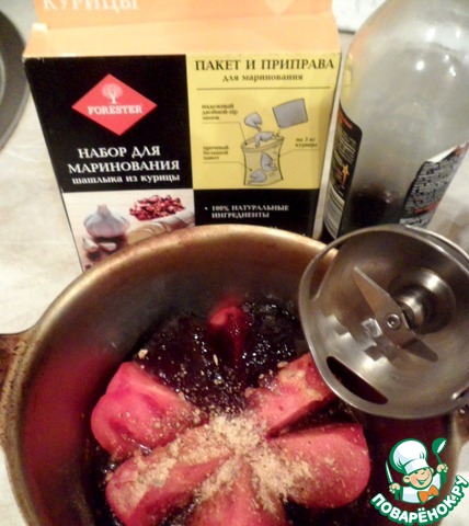 Готовим для них маринад, для этого нам надо в чашу положить нарезанный помидор, 2 ст. л. соевого соуса, 1/3 пакета «Набора для маринования шашлыка из курицы» от компании Forester, 2 ст. л. сливового джема и 1 ст. л. яблочного уксуса.