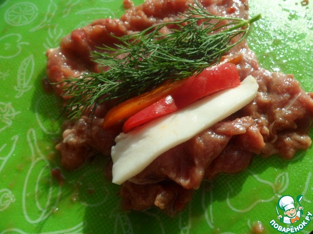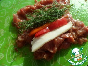 Достать филе, разрезать на 2 части, на каждую положить по 2 ломтика болгарского перца, кусочек копченого сала и веточку укропа.