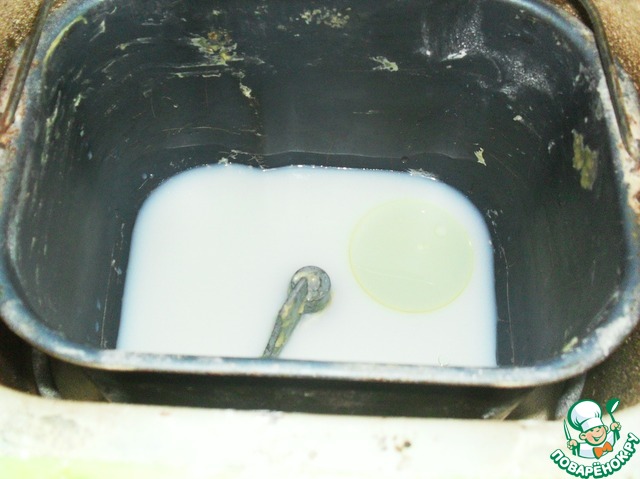 В чашу х/п заливаем воду с молоком и масло растительное, засыпаем сахар, соль.