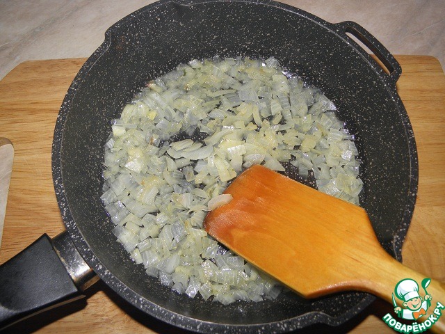 Лук мелко нарезать, выложить в сковороду, залить бульоном, потушить на маленьком огне до мягкости и прозрачности.