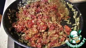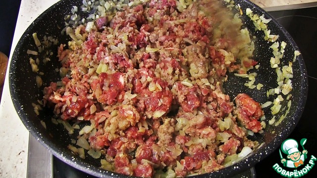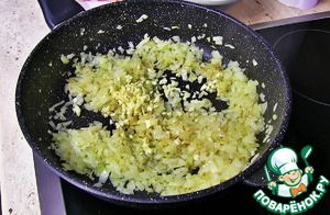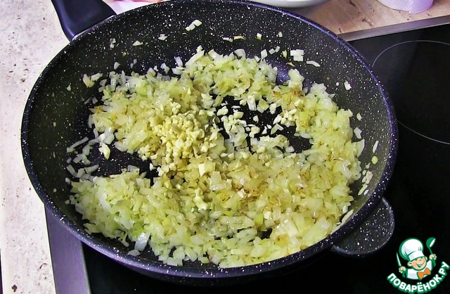 В сковороду влить 1 ст. л. растительного масла, обжаривать лук 5 минут, добавить чеснок и жарить еще 2 минуты.