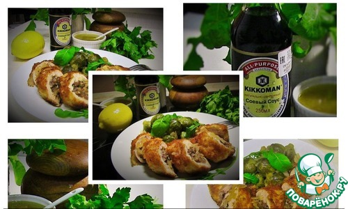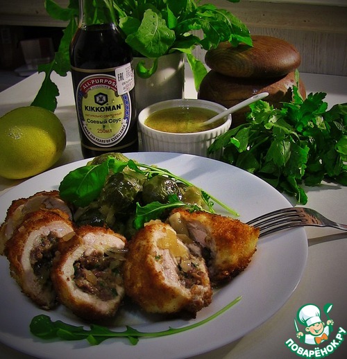 Выкладываем начинку на филе и заворачиваем в рулет.