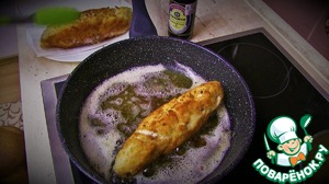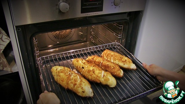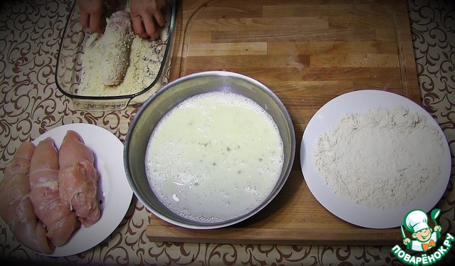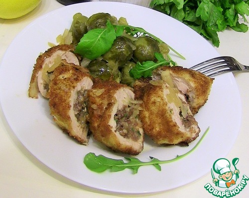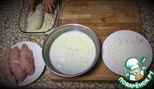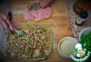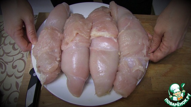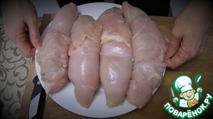 Куриные грудки разрезать вдоль не до конца. Филе слегка отбить.