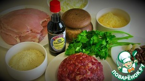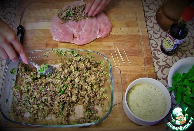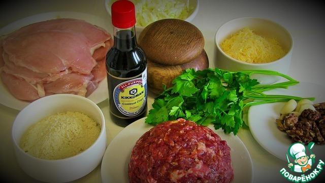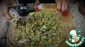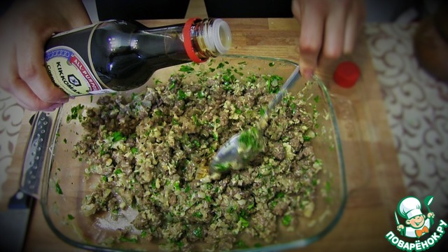 Смешать готовый фарш с петрушкой, грецким орехом, сыром. Добавить 1 ст. л. соевого соуса и 1 куриное яйцо.