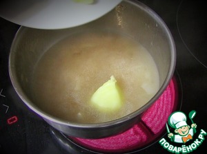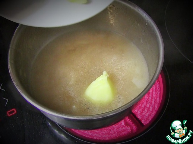 Соус. В сотейнике на 1 ч. л. растительного масла обжариваем лук, добавляем 100 мл. бульона, 1 ч. л. винного уксуса, 1 ст. л. соевого соуса. Варим 10 минут. Добавляем 50 г. сливочного масла.