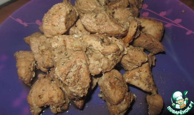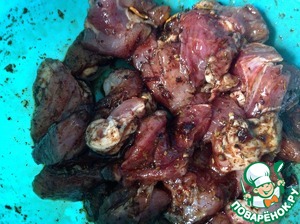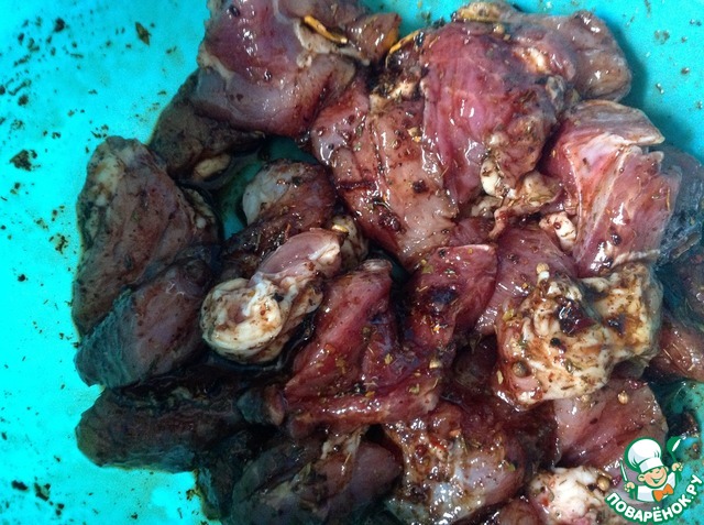 Мясо нарезать некрупными кусочками и выложить в маринад минимум на час.