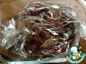 Мясо выложить в пакет для запекания вместе с маринадом. На пакете сверху сделать пару проколов ножом. Пакет поместить в посуду для запекания и отправить в духовку на 30 мин. при 200 град.
