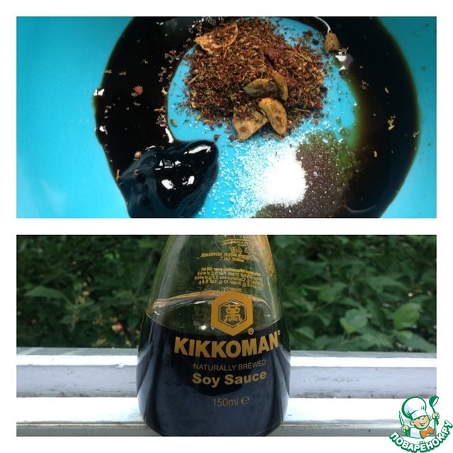 В посуду для маринования выложить специи и соль по желанию. Влить соевый соус, бальзамик, добавить сахар. Тщательно перемешать маринад.