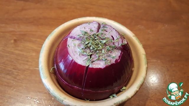 Вымыть луковицу. Вытереть. Не очищая кожуру, срезать немного корешки снизу и крышечку сверху. Как на фото. Сделать два надреза ножом до середины луковицы. Поставить лук в форму для запекания. Посыпать тимьяном.