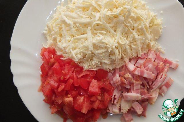 Для начинки мелко режем помидор и бекон, на крупной тёрке натираем сыр.