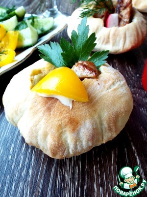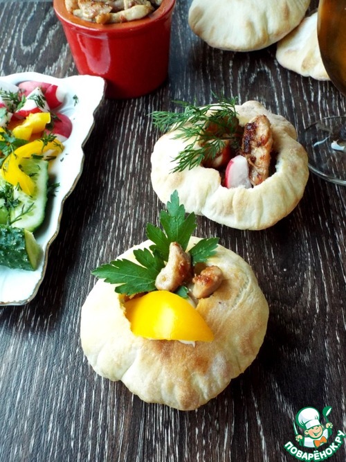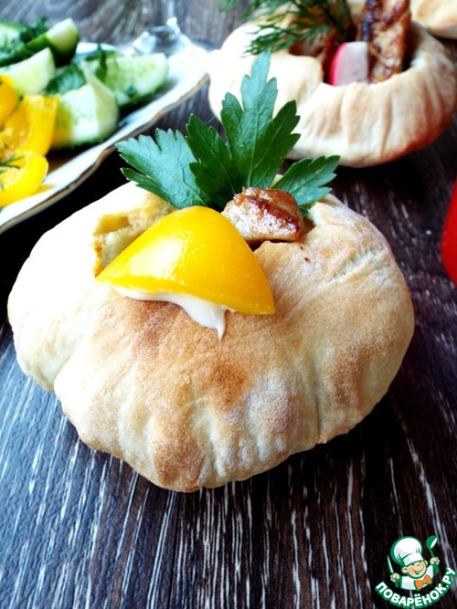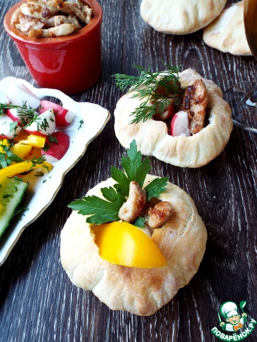 Повстречались мне на одном кулинарном форуме лепешки, наполненные салатом. Мне захотелось их наполнить мясом и свежими овощами. Получились своего рода чашки или корзинки, суть не в названии. Это очень вкусно. Эти хлебные лепешки похожи на "питу", но здесь тесто очень тонкое и местами хрустящее. Держат форму шара и на следующий день. Легко взять с собой на природу и наполнить, чем душа пожелает. Я в этот раз замариновала куриное мясо в специях от Forester и моментально поджарила его на очень удобной решетке-гриль этой же фирмы. Ужин удался.