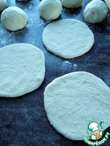 Стол присыпать мукой. Раскатать лепешки высотой 2 мм.