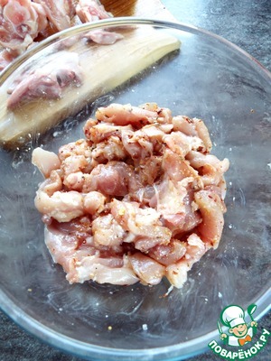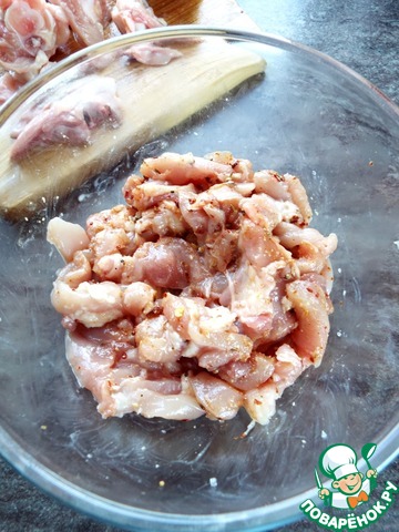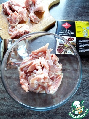 С куриных бедер срезать мясо и нарезать на небольшие кусочки. У меня вышло 400 г мяса.