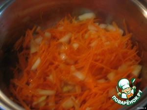 А в кастрюле, где будем готовить само рагу, обжариваем на раст.масле тертую морковь и лук.