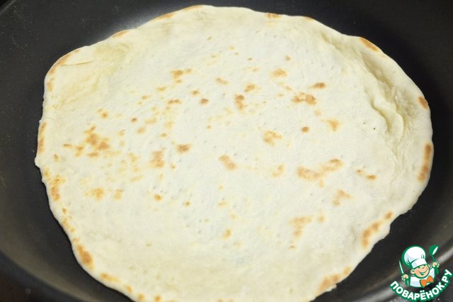 • Тесто делим на четыре части, раскатываем лепешки. Обжариваем на сухой сковороде до зарумянивания с двух сторон.