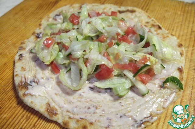 Лепешку смазываем соусом, выкладываем часть овощей.
