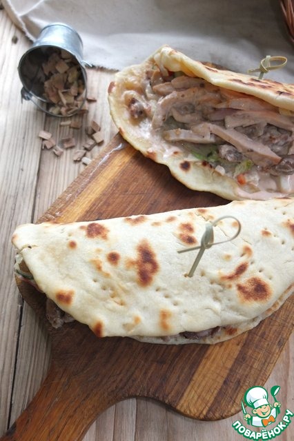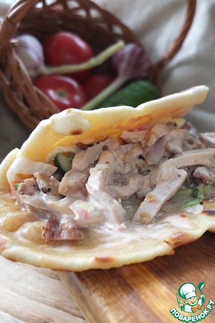 • Сверху выкладываем курицу и поливаем соусом. Складываем лепешку пополам. Если это необходимо фиксируем зубочисткой.