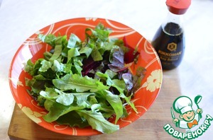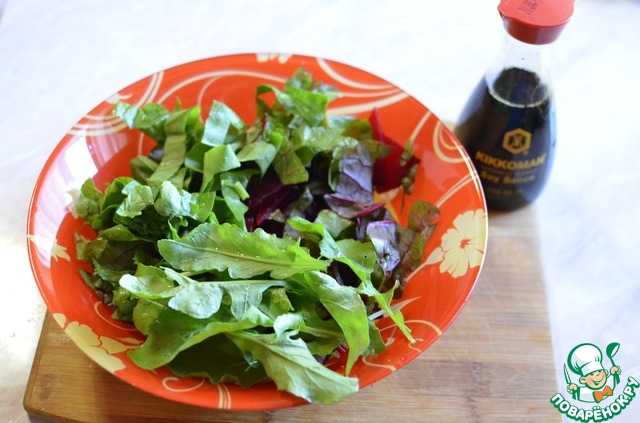 Заправить оливковым маслом и соевым соусом "Киккоман"