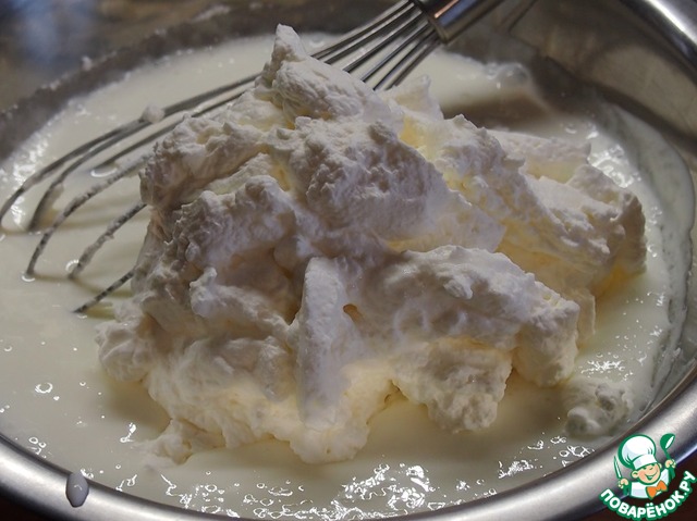 Взбить сливки с сахарной пудрой, перемешать сливки со сметанно-йогуртовой массой. Добавить желатин, перемешать.