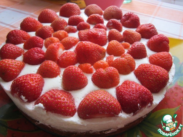 На остывший корпус разложить половину начинки. Сверху разложить клубнику. Поверх вылить остальную начинку, разровнять поверхность. Поставить форму с пирогом в холодильник до полного застывания начинки.