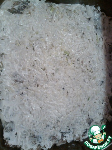 Теперь смазываем противень растительным маслом и выкладываем слоями: сначала картофель вареный (режем по вкусу, мне нравится помельче), смазываем майонезом