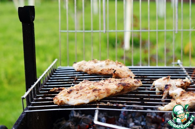 Разжечь угли, поставить решётку-гриль Forester и выложить на неё замаринованные грудки.