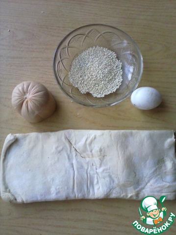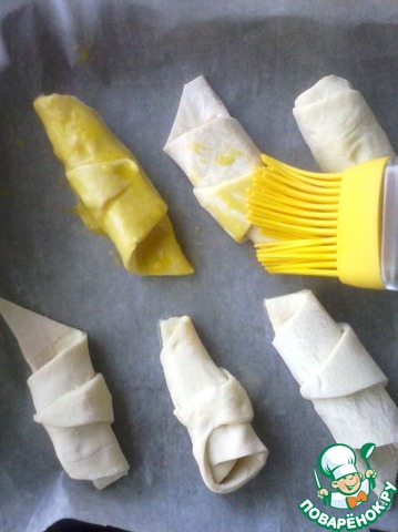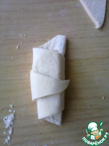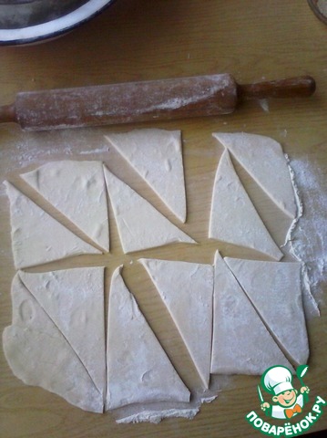 Даем тесту минут 10 полежать на столе. После чего раскатываем его толщиной 2-3 мм. Разрезаем его на треугольнички.