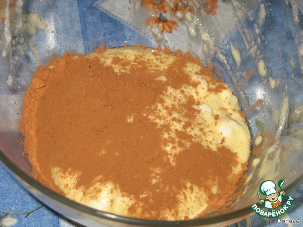Тесто разделить на две неровные части. В меньшую добавить какао.
