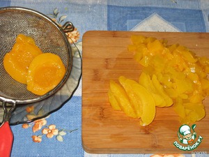 Для начинки я использовала половинки персика в сиропе. Предварительно надо их откинуть на сито, чтобы стек сок. Потом порезать мелко, а можно размять в пюре.