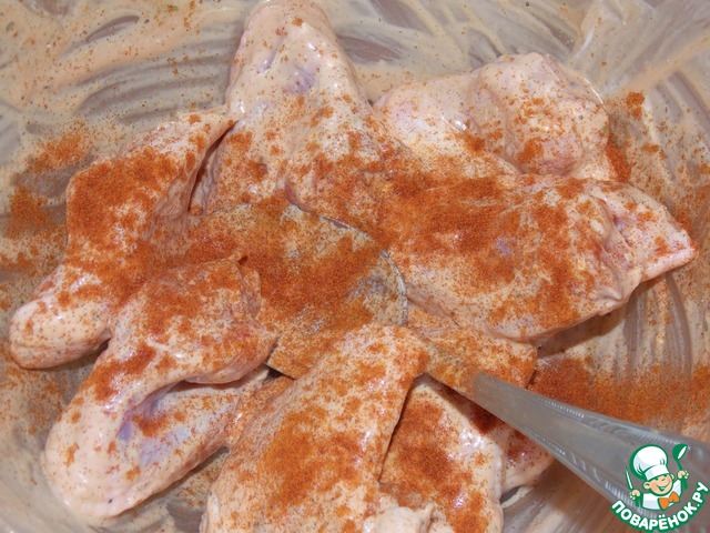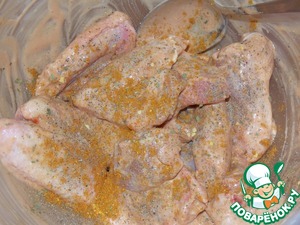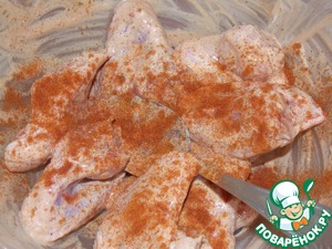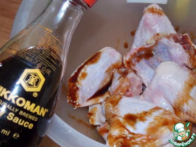 • У крыльев отрезать кончики. Сложить в миску, полить 1ст. л. соевого соуса.