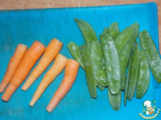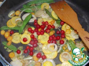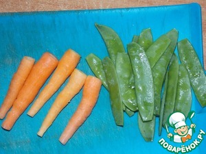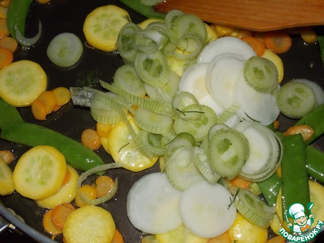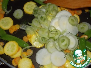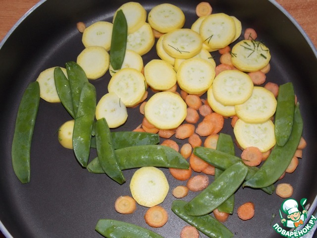• В сковороду налить 2ст. л. растительного масла, обжарить морковь, кабачок и горошек в течение 2-3 минут.
