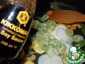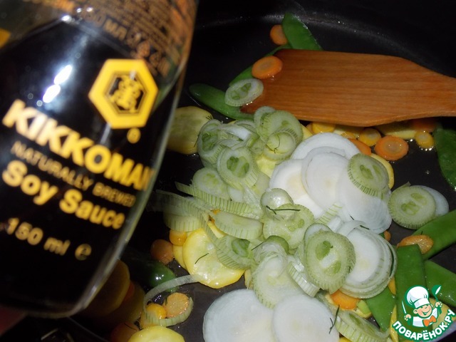 • Влить 1ст. л. соевого соуса, добавить щепотку соли и перца.