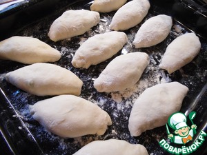 Сформировать пирожки, выложить их на присыпанный мукой противень, смазать взбитым яйцом.