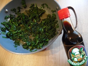 Шпинат и зеленый лук нашинковать, обжарить на растительном масле 1-2 минуты, помешивая, добавить соевый соус, приправить перцем, тушить еще 3 минуты.