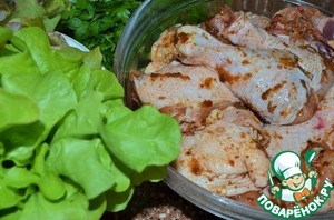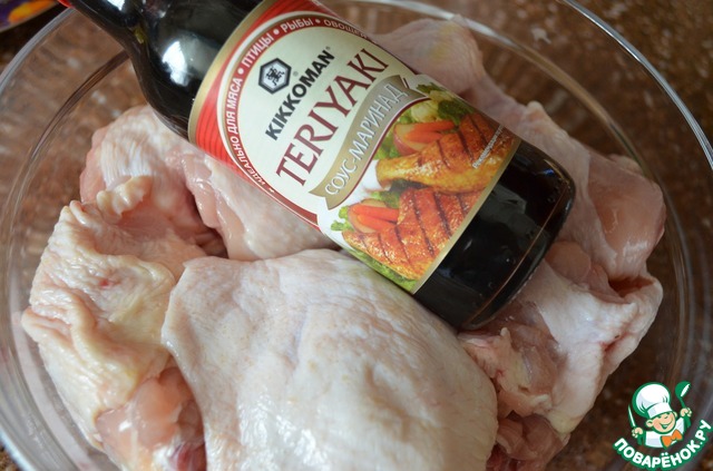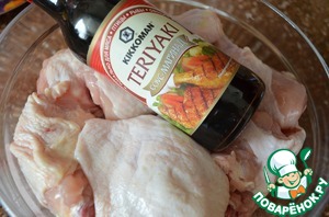 • Курицу вымыть, разрезать на порционные куски (бедра, голень, крылья и т. п.), выложить в миску, залить соус-маринадом Teriyaki от Киккоман, перемешать и оставить на 30 минут. За это время перемешать пару раз курицу для лучшего проникновения соуса - маринада в мясо.
