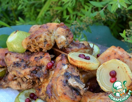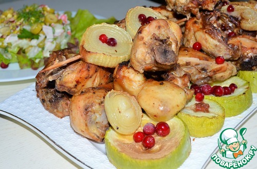 Курицу выложить на решетку, разложить между кусками кабачок, луковицу также нарежьте на шайбы.