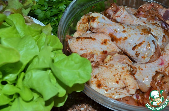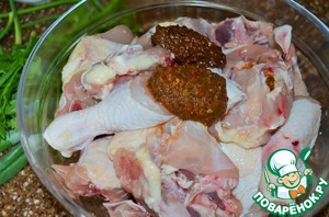 • Через полчаса вновь перемешать курицу, добавить аджику Кавказскую острую, перемешать. Закрыть и мариновать 1,5 и более часа. Возможно маринование до 3 суток, только в холодильнике.