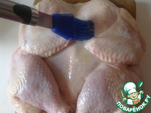Растопите сливочное масло и со всех сторон смажьте маслом цыпленка.