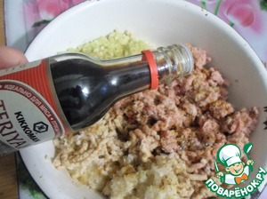 Добавляем соевый соус, хмели-сунели, соль, смесь перцев, яйцо.