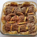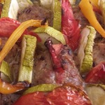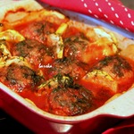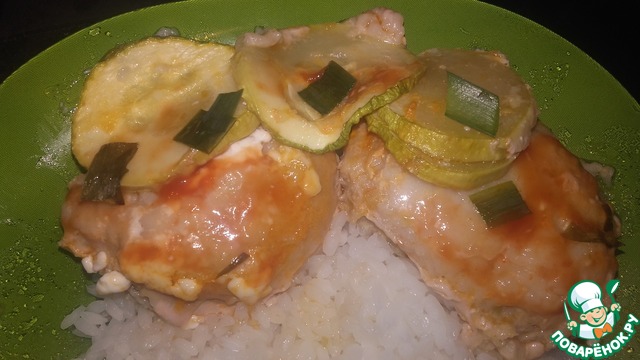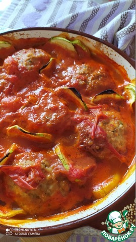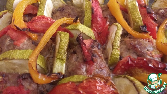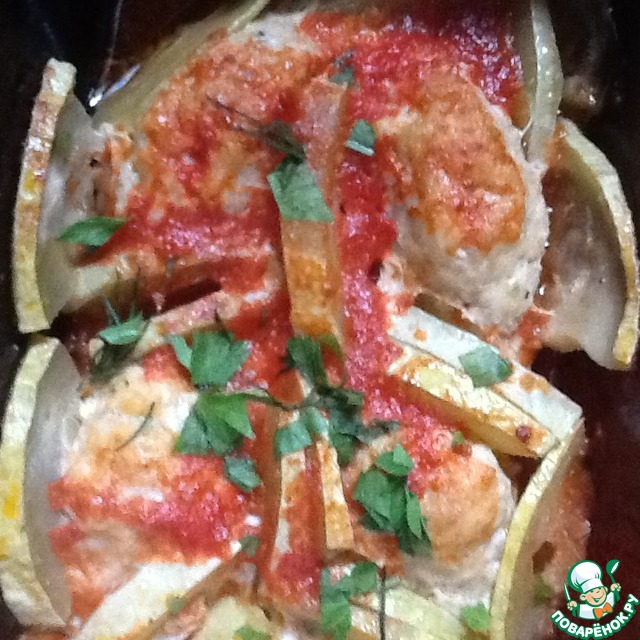 Формируем котлеты, обваливаем в муке, выкладываем в смазанную растительным маслом форму для запекания, обкладываем с 2 сторон кабачками. Вот такая получается комбинация. Запекаем в предварительно разогретой до 180 градусов духовке 20 минут.