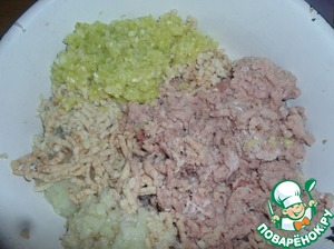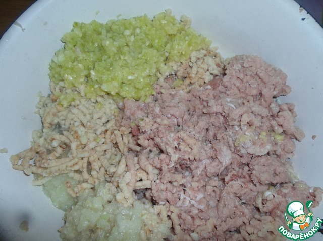 Берём фарш, добавляем пропущенные через мясорубку: кабачок, чеснок, лук, батон.