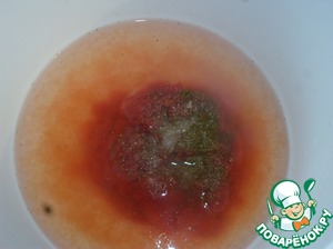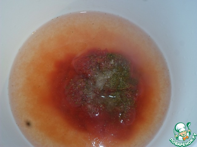 Для соуса смешиваем томатную пасту, кипяток, соль, хмели-сунели.