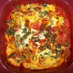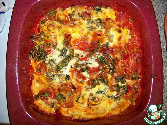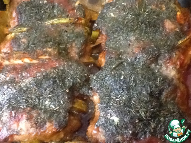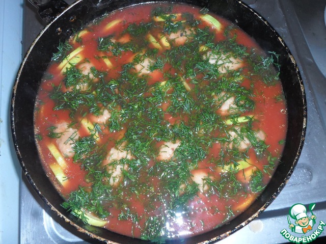 Через 20 минут с начала запекания, вытаскиваем форму и выливаем в неё соус. Посыпаем мелко рубленной зеленью укропа. Запекаем ещё 20 минут.