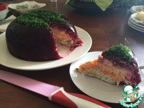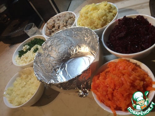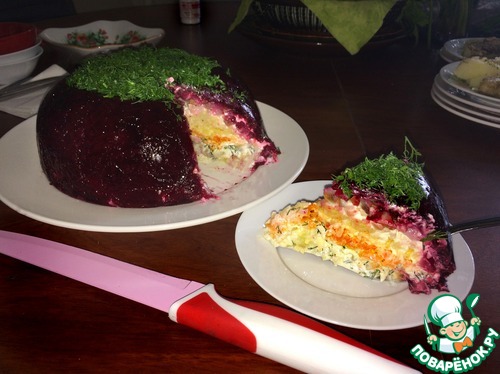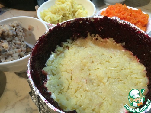 Свёклу отжать, собрать сок и растворить в нём столовую ложку желатина. Обратно вылить в свёклу. Присолить, перемешать, убрать в холодильник. Желатин, во-первых, нужен для того, чтобы готовый салат держал форму. Во-вторых, чтобы свекольный сок не пропитывал остальные слои.