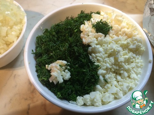Разделить яйца на желток и белок, мелко порезать, к белку добавить укроп. Присолить.